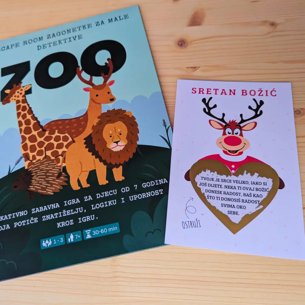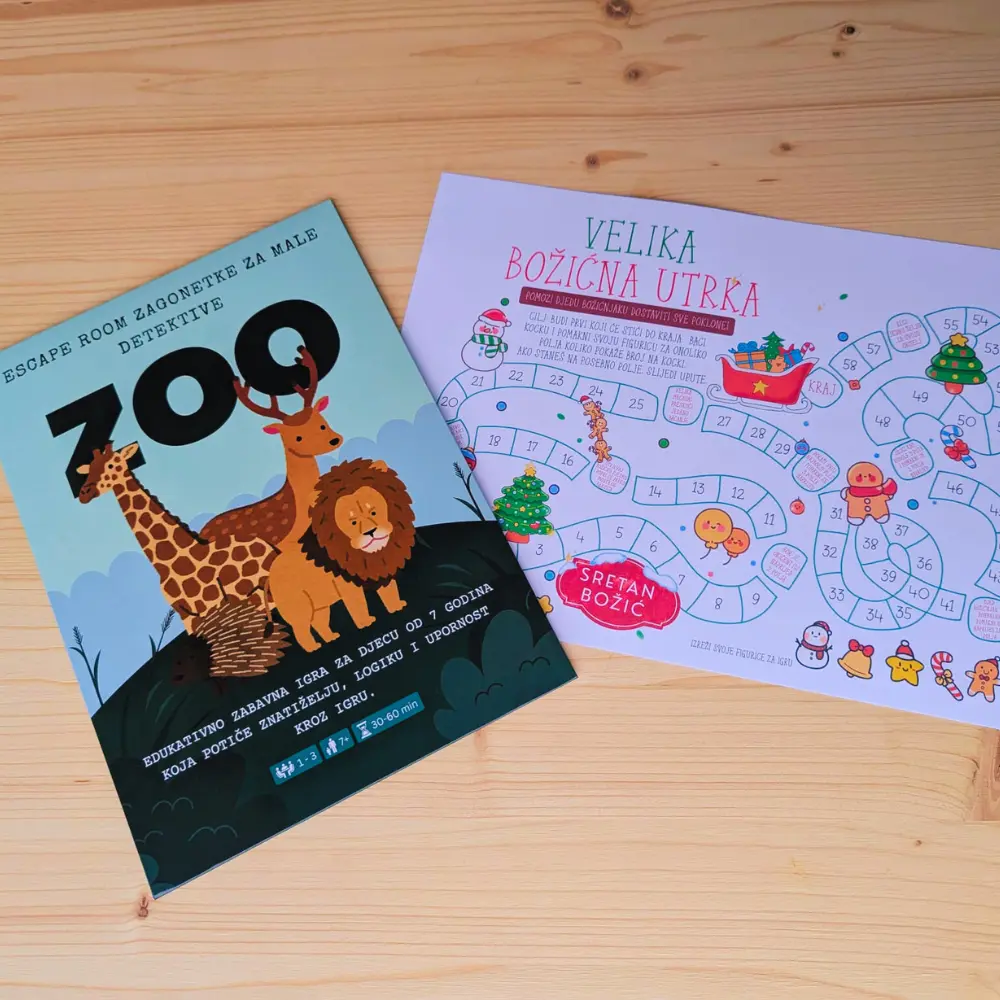 Uz kupnju igre Escape Room Zagonetke za Male Detektive – ZOO, dobivaš besplatnu božićnu društvenu igru u PDF formatu 🎁. Ispiši je kod kuće, izreži figurice i zaigraj s djecom veselu blagdansku avanturu – savršenu za zajedničke trenutke i smijeh pod lampicama. ✨